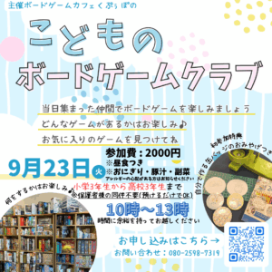 毎月ご好評いただいている《こどものボードゲームクラブ》、次回は 9月23日(日) に開催します!
